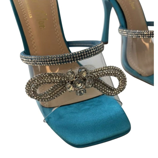 CHASE+CHLOE/ Turquoise Bow / Blue / Rhinestone / Embellished/ Heeled Sandals With Satin / Finish & Transparent Straps / Size 6