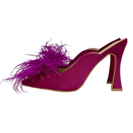KAYLEEN / Cailin-20 / Pink Satin / Mule Heels / With Feather Embellishment & Unique Heel Design