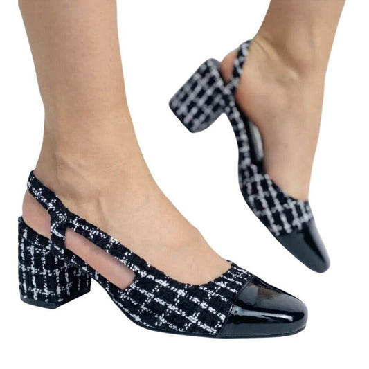 LILIANA / Kaya-3/ Black & White / Tweed / Block / Heel Slingback / Shoes With Patent Toe